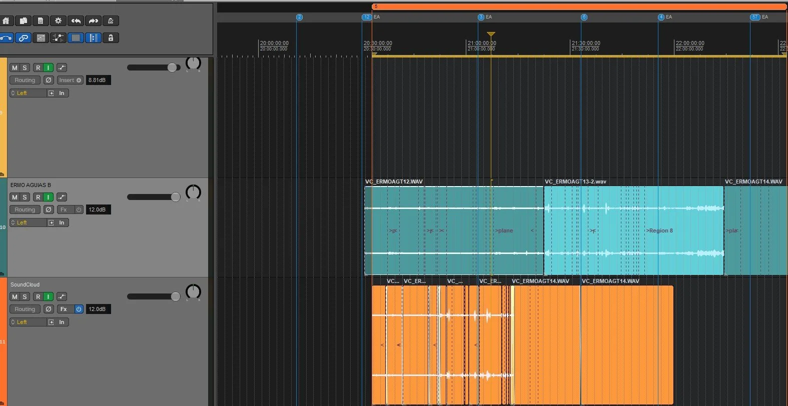 As the picture shows, I have one track per day of recording, in order, and each audio file starting at their own original starting time. The markers on top stay at the start of the file and their ID number corresponds to the number of each file’s numbering system. The colour scheme also helps me out: the original material - both the audio clips and their markers - have one colour (green in this case). Later on, the regions that have been exported to different platforms or projects have their own colour as well. For me this is the best way to always know and to keep track of what I have done with certain audio segments, which I find really important on the long-term. Sometimes I am asked for exclusive material, or if I want to diversify what I publish between soundcloud, earth.fm or what goes into my bandcamp albums, then with the region system and a track assigned to each of these platforms (as you see earth.fm in yellow on the bottom of the track list). But more on this later.
